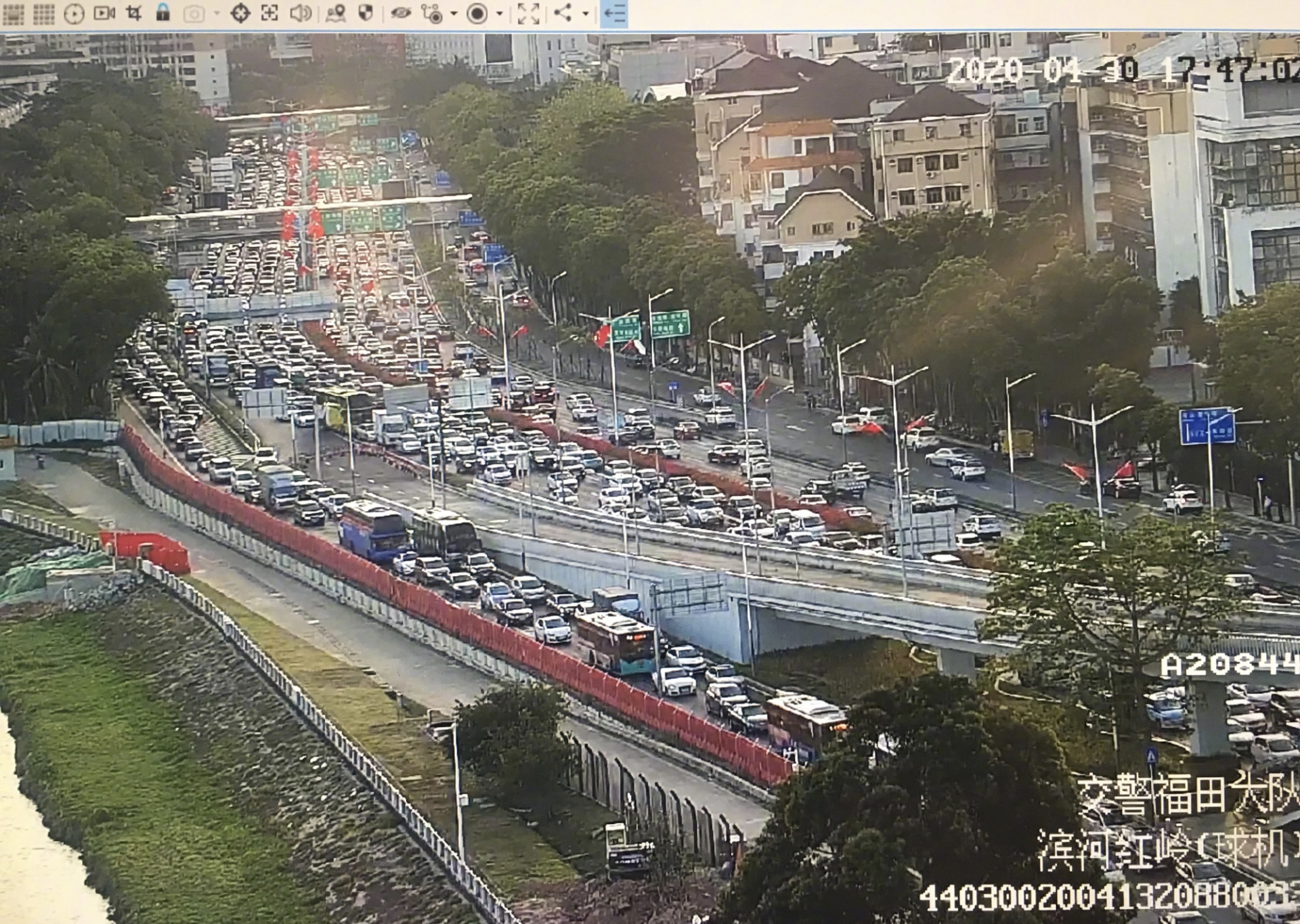 濱河大道是深圳市最先進(jìn)入晚高峰節(jié)奏的道路,15時30分,濱河大道寶安立交路段西往東方向開始出現(xiàn)車多緩行。車流量慢慢增多,到18時許,濱河大道西往東方向發(fā)生嚴(yán)重交通擁堵,從竹子林立交到鹿丹村路段一片“紅燈”。