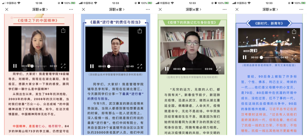 深圳職業(yè)技術(shù)學(xué)院學(xué)生工作部組織33位青年輔導(dǎo)員,推出33講戰(zhàn)“疫情”系列微課程,每天8:30準(zhǔn)時(shí)推送。微課程主題涵蓋愛國主義教育、理想信念教育、生命教育、社會責(zé)任感教育、感恩教育,不同的主題、不同的視頻、不同的感悟,輔導(dǎo)員老師和同學(xué)們一起在戰(zhàn)“疫”中成長,為同學(xué)們講述每一個(gè)戰(zhàn)“疫”的感人故事。建環(huán)學(xué)院輔導(dǎo)員薛菲菲老師制作精美短視頻、撰寫文案、配樂、配音,以有思想又有溫度的方式與學(xué)生對話。她說,磨煉是成長的催化劑,抗疫是時(shí)代給予的成人禮,經(jīng)此一役,中國的年輕人們對責(zé)任和奉獻(xiàn)的感受更加直觀,對勇敢和擔(dān)當(dāng)?shù)睦斫飧由羁?,而中國,也因?yàn)?0后,收獲了青春洋溢的蓬勃力量!