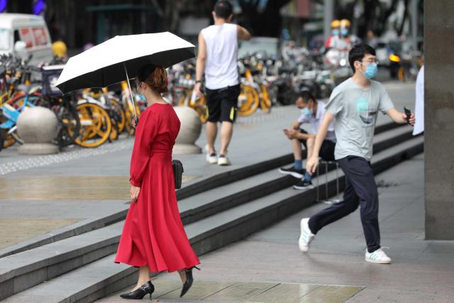▲走在街上,熱浪撲面而來,耀眼的陽光把人曬得睜不開眼,行人紛紛拿起手頭物品遮擋烈日。
