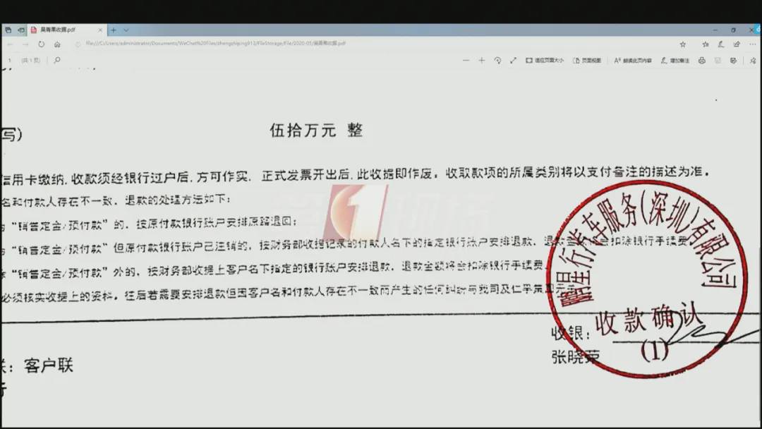 ↑ 50萬(wàn)首付款收據(jù),上有車(chē)行公章