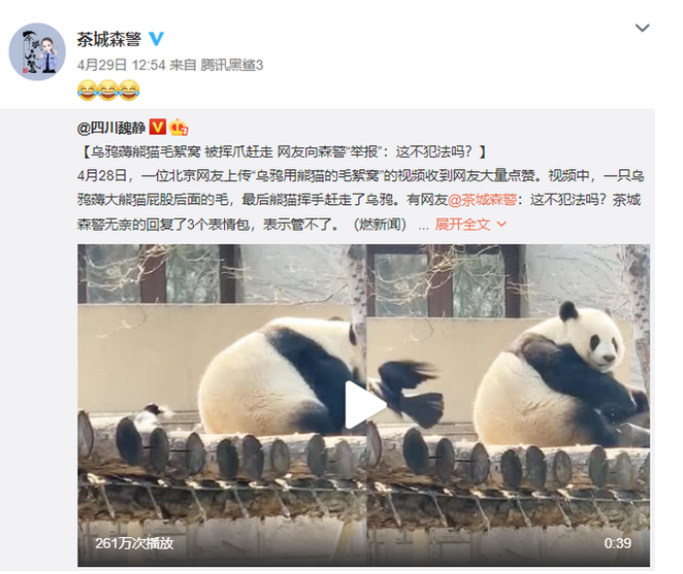 5月6日,有網(wǎng)友爆料,北京動(dòng)物園有烏鴉在熊貓身后薅屁股毛。