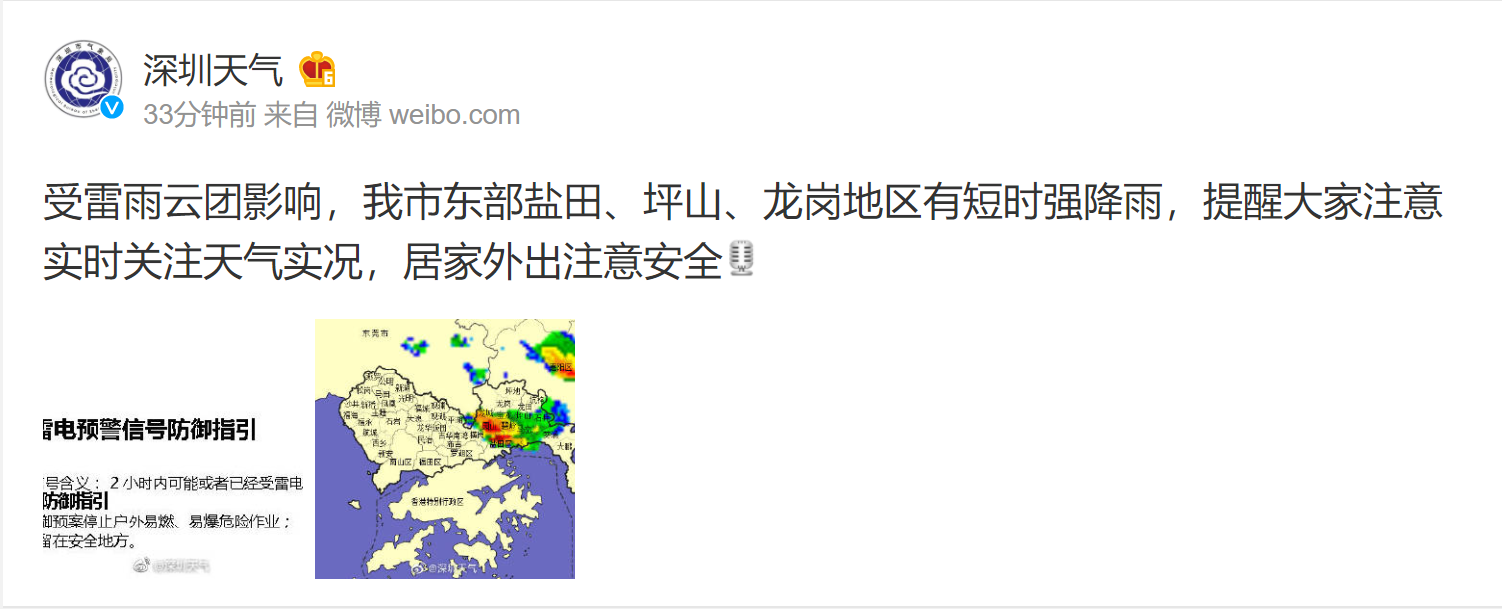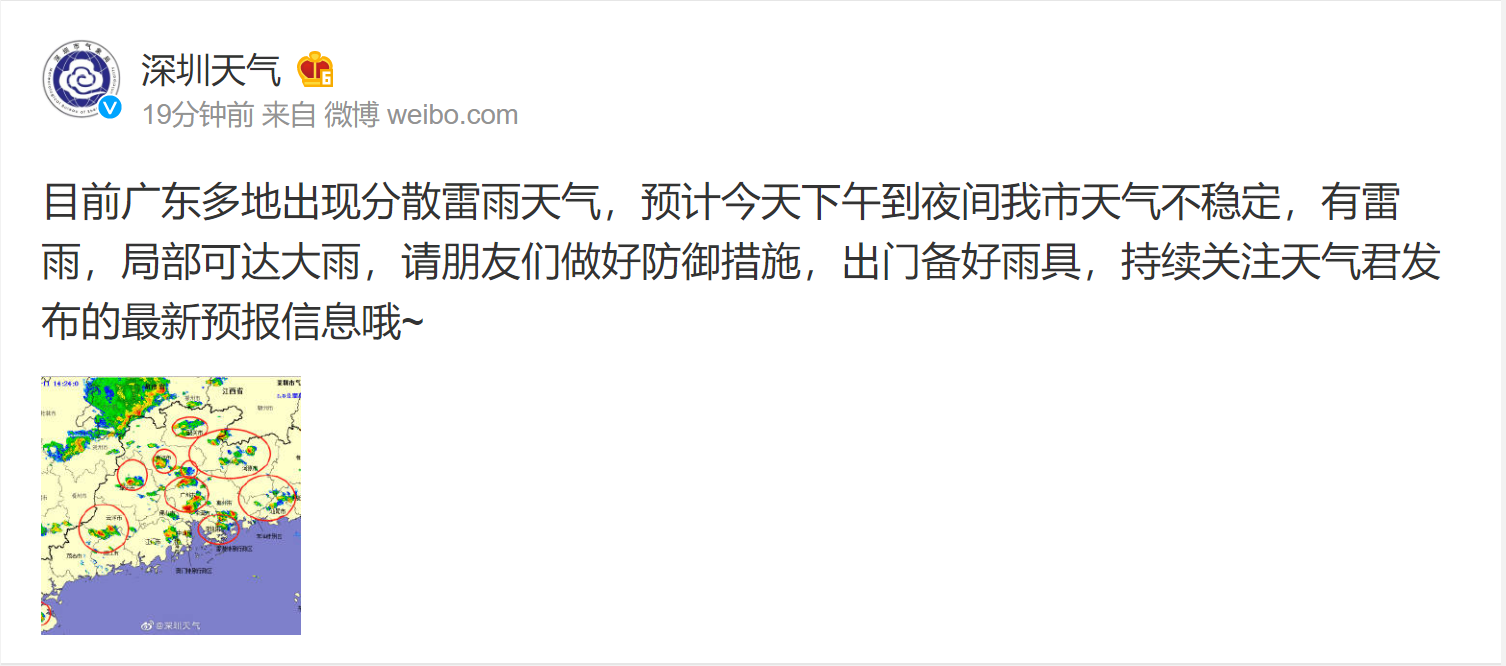 據(jù)@深圳天氣消息,目前廣東多地出現(xiàn)分散雷雨天氣,預計今天下午到夜間深圳天氣不穩(wěn)定,有雷雨,局部可達大雨,請大家做好防御措施,出門備好雨具,持續(xù)關注深圳天氣發(fā)布的最新預報信息。