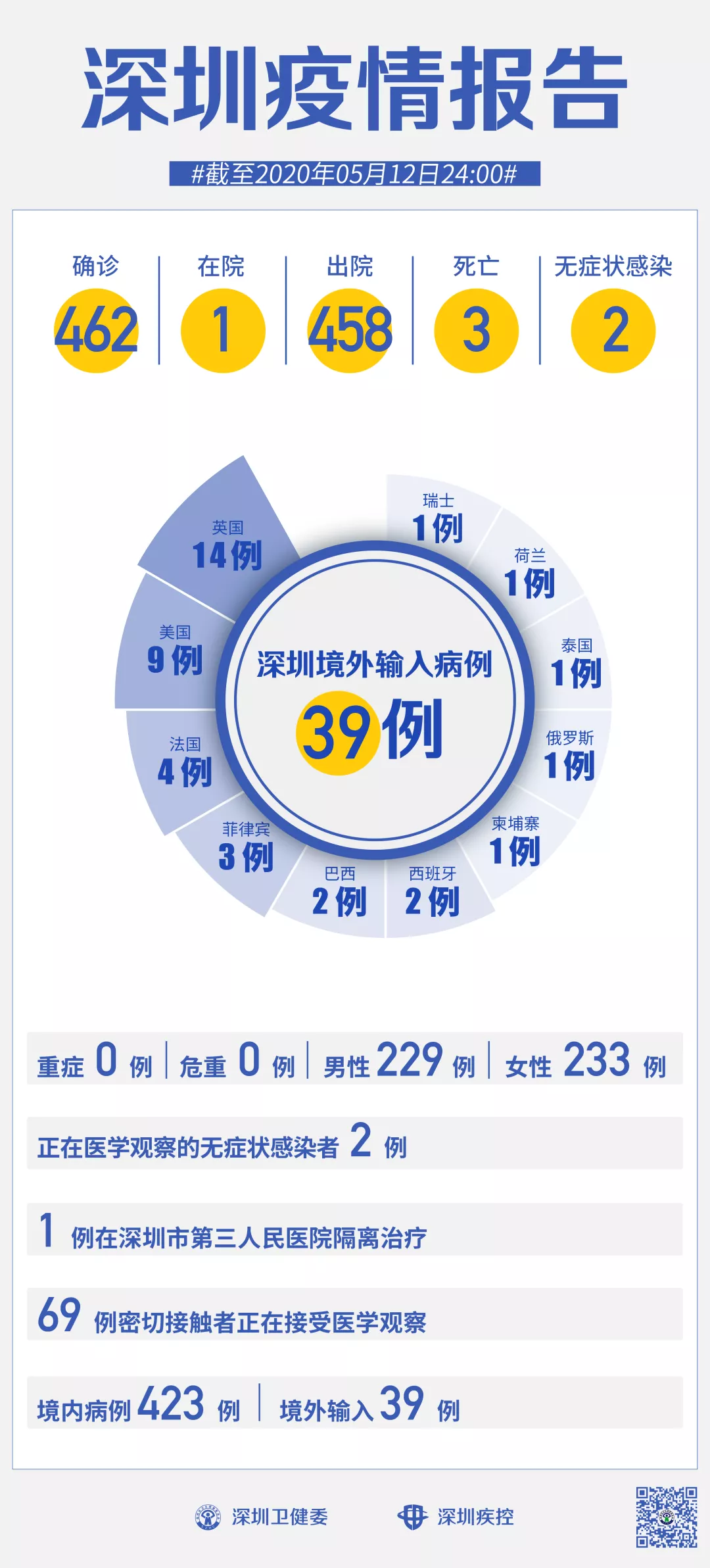 截至5月12日24時,深圳累計報告新冠肺炎病例462例。