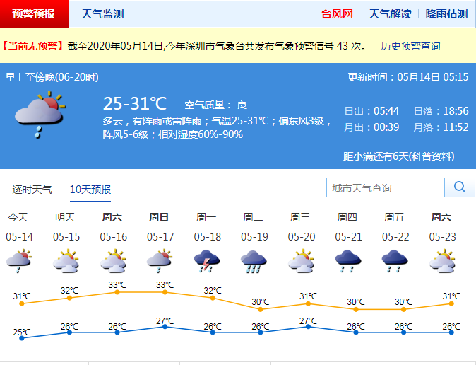 見圳客戶端·深圳新聞網(wǎng)2020年5月14日訊 還記得前兩天的強(qiáng)對(duì)流天氣嗎?目前仍是雷雨橫行的季節(jié),臺(tái)風(fēng)還需往后靠靠,臺(tái)風(fēng)未來兩天不會(huì)影響深圳。據(jù)市氣象臺(tái)消息,14日深圳以多云天氣為主,但仍有分散陣雨,大家外出記得帶傘,遮陽又能遮雨。