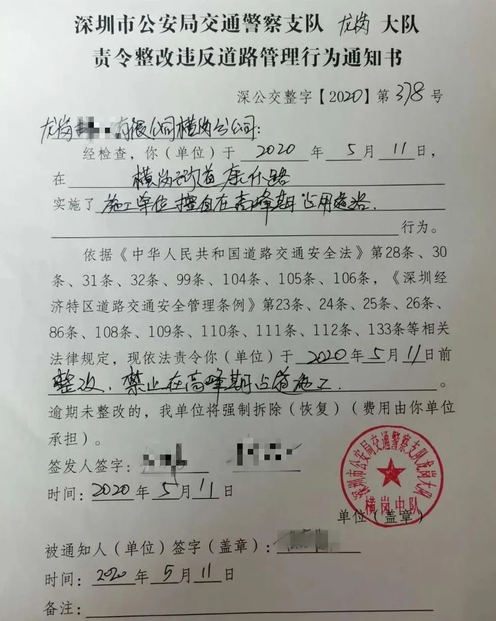 龍崗**有限公司橫崗分公司擅自在高峰期占用道路施工,執(zhí)勤民警責令立即整改、撤離現場。