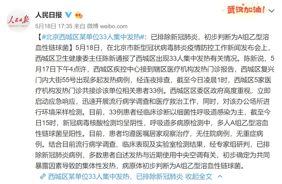 目前,33例患者經(jīng)臨床診斷以細菌性呼吸道感染為主,截至5月18日15時,新冠病毒核酸檢測均呈陰性,呼吸道多病原檢測中,多人A組乙型溶血性鏈球菌呈陽性。