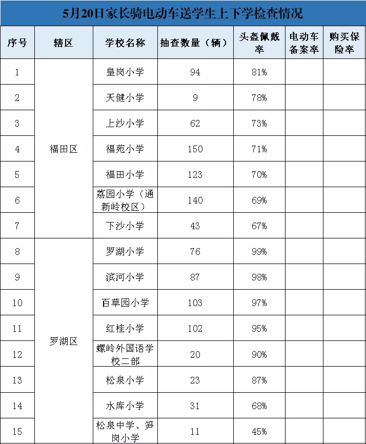 5月20日,深圳交警在全市范圍內(nèi)選取了70所學校進行抽查,共5037輛電動車被查,頭盔佩戴率達89%。其中松泉中學、筍崗小學、西麗學校、福華學校頭盔佩戴率不足一半。
