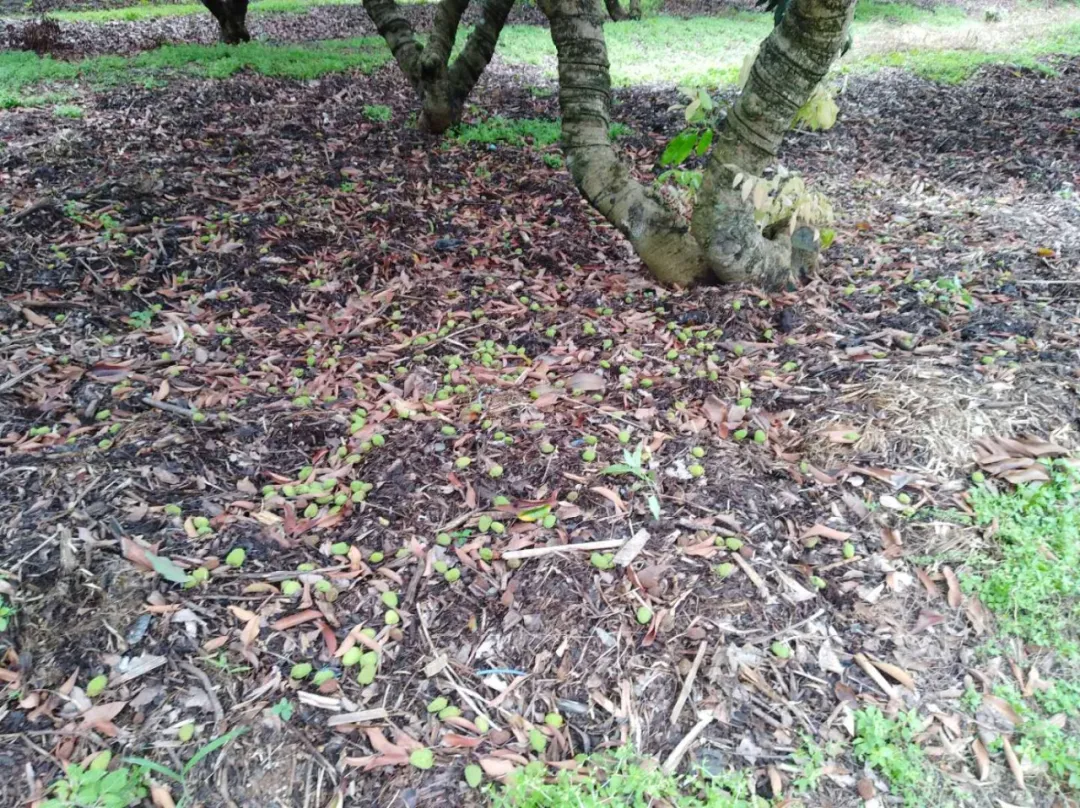 不遠處的另一片果地里,是另一番景象。枝頭上,糯米糍、桂味一片青綠,爆裂的糯米糍散落一地。