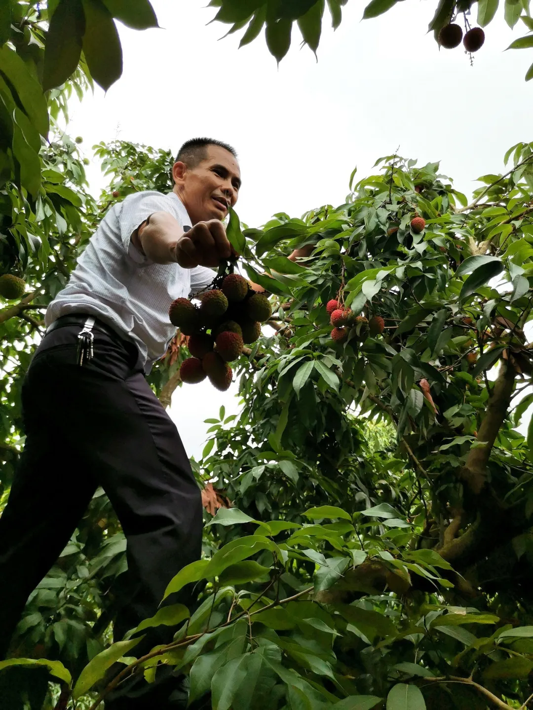 5月28日,西麗果場的種養(yǎng)專家邱金淡一早來到園區(qū),開展病蟲防治,清理荔枝樹上破裂的荔枝。前幾日,一場猛烈的龍舟雨,讓長勢(shì)正旺的糯米糍遭受當(dāng)頭一擊,不少爆漿裂果。邱金淡在南山種植荔枝20多年,對(duì)各種“天災(zāi)意外”波瀾不驚,談起今年的收成,他苦笑著說,“種植就是看老天爺吃飯”。受雨水影響,糯米糍、桂味減產(chǎn)明顯。早熟品種妃子笑受影響較小,已由青轉(zhuǎn)紅成熟,開始陸續(xù)上市。