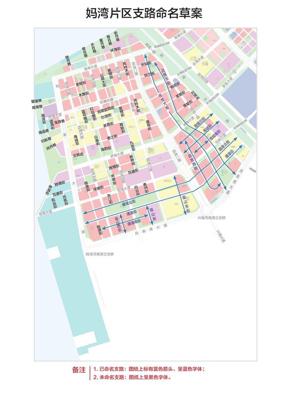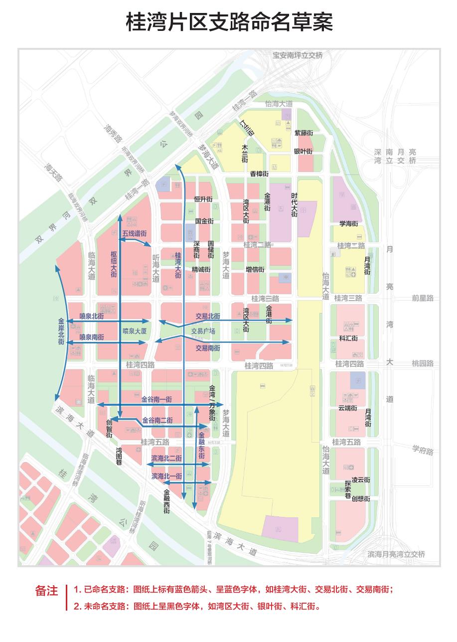其中,桂灣片區(qū)共約37條(包括已命名支路13條,本次擬定支路命名草案24條),前灣片區(qū)約39條(包括已命名支路20條,本次擬定支路命名草案19條),媽灣片區(qū)共61條(包括已命名支路12條,本次擬定支路命名草案49條)。同時(shí),將代表前海門戶通道的主干道“前灣一路”更名為“前海大道”。