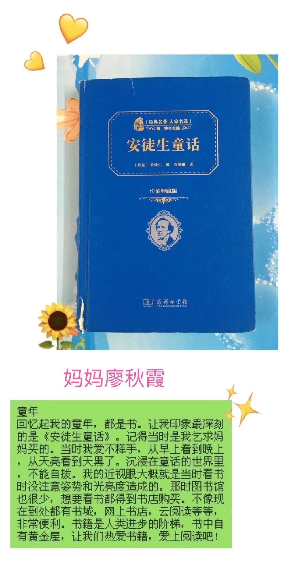 在這快樂的節(jié)日里,我也讓媽媽和我分享了她記憶中的六·一,她好好思考了一會兒說:"還是非常巧的,記憶最深的六·一,也是和你同歲的那一年,那是我在重慶老家過的最后一個六·一。記得當(dāng)日穿上了最漂亮的衣服,戴上了紅領(lǐng)巾,早早就去了學(xué)校,在簡單的慶?;顒雍螅陀衫蠋煄ьI(lǐng)成績優(yōu)秀的同學(xué)到公社的禮堂去看慶祝表演活動,從學(xué)校走到公社要一個多小時,大家一邊走一邊唱《快樂的節(jié)日》,非常的歡樂,感覺自己好似真的變成小鳥了,在會場里每位同學(xué)都收到了一個驚喜的小禮包,三十幾年過去現(xiàn)在回想起來快樂的感覺仍很深刻!好似六·一的感覺就停頓在那個時候,后來在深圳過的六·一印象反而都模糊了?!?/p>