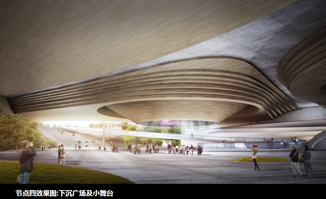 南側(cè)主體建筑之下的藝術開放大廳,連續(xù)的吊頂在這里變化、發(fā)散又聚合,自然圍合出具有先鋒藝術水準的表演舞臺和藝術體驗館區(qū)域。