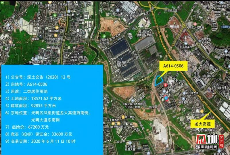 光明A614-0506宗地位于光明區(qū)鳳凰街道龍大高速西南側(cè)、光明大道東南側(cè),土地用途為二類居住用地,起始價為6.72億元,土地面積為18571.62平方米,建筑面積為9.29萬平方米。該宗地建設住宅類型為出售的人才住房,項目建成后宗地出售的人才住房銷售基準售價不高于2.9萬元/平方米,最高售價不高于3.05萬元/平方米。