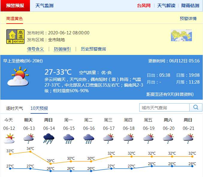 見圳客戶端·深圳新聞網(wǎng)2020年06月12日訊 深圳市氣象臺(tái)于2020年06月12日08時(shí)00分在全市陸地發(fā)布高溫黃色預(yù)警,預(yù)計(jì)12-13日深圳市最高氣溫將升至35℃以上,信號(hào)可能持續(xù)2天,做好防暑降溫工作,避免長(zhǎng)時(shí)間戶外或者高溫條件下的作業(yè)。