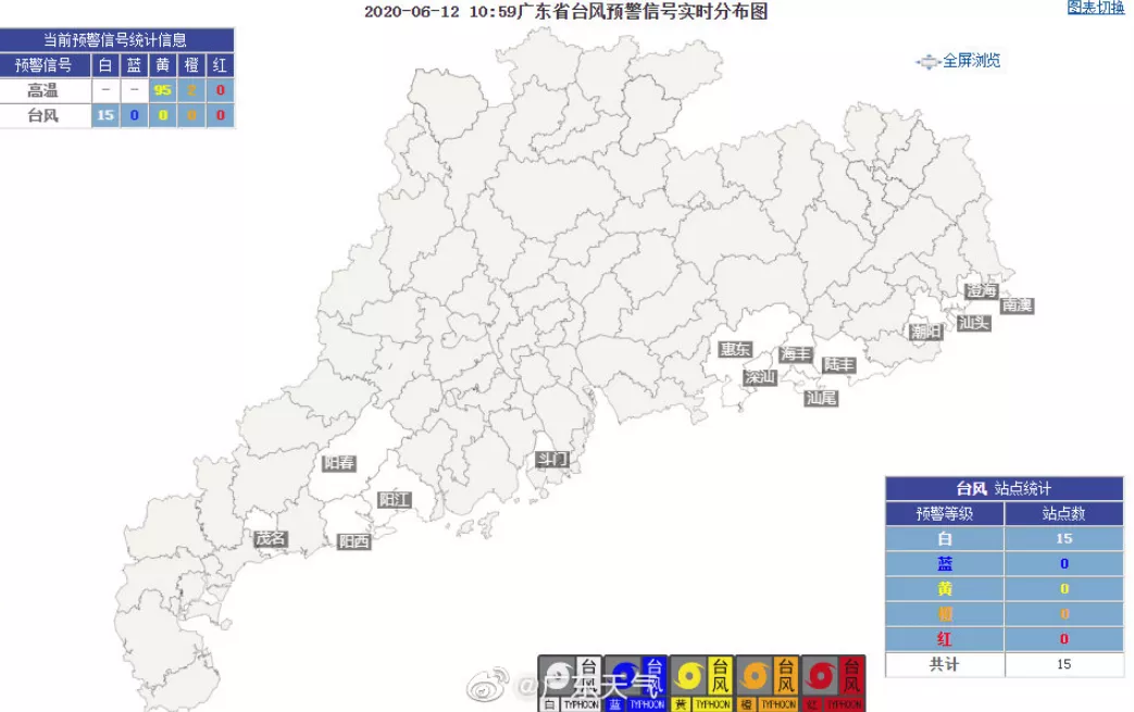 廣東省氣象局6月12日10時啟動重大氣象災害(臺風)三級應急響應。目前,廣東沿海陸陸續(xù)續(xù)臺風白色預警信號都在亮起,深圳在2020年6月12日12時發(fā)布臺風白色預警。