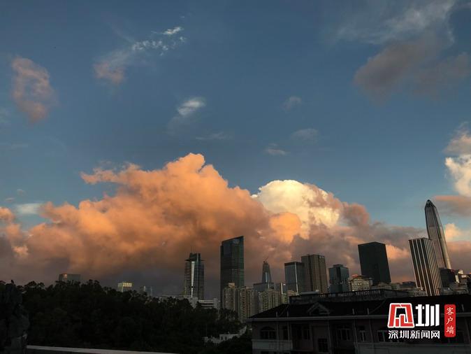 下午19點,夕陽將云朵染成橙色。