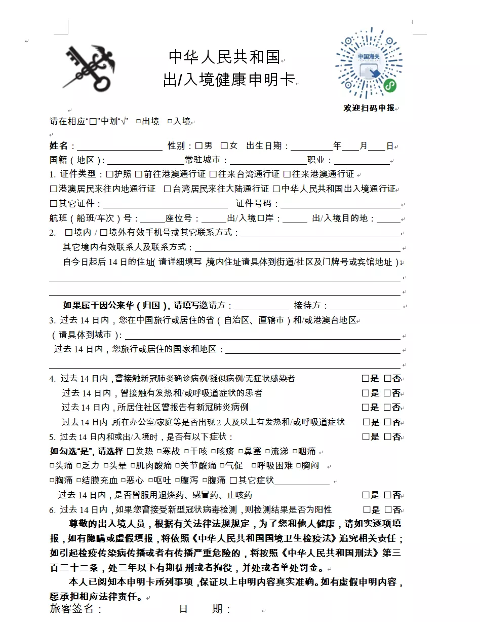 一、請(qǐng)?zhí)崆跋螺d打印《健康申明卡》(見(jiàn)附件1),或關(guān)注“海關(guān)旅客指尖服務(wù)小程序”(見(jiàn)附件2)。提前如實(shí)填寫(xiě)紙質(zhì)或電子健康申報(bào)信息,通關(guān)時(shí)主動(dòng)向海關(guān)申報(bào)。