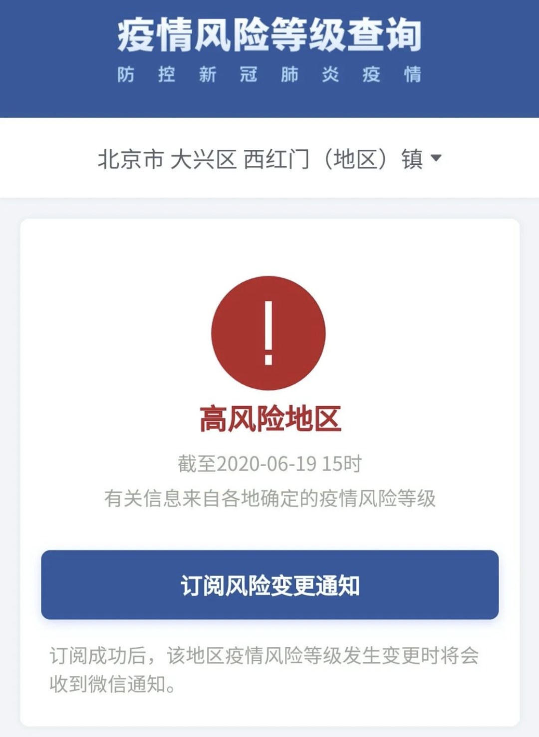 截至6月19日15時,北京大興西紅門(地區(qū))鎮(zhèn)從中風險地區(qū)升級為高風險地區(qū)。