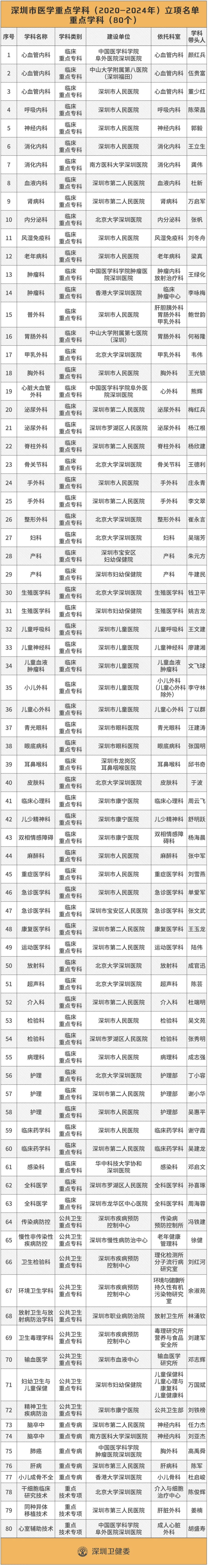 6月19日,深圳市衛(wèi)健委公布了2020-2024年的深圳市醫(yī)學(xué)重點(diǎn)學(xué)科立項(xiàng)名單,包括80個重點(diǎn)學(xué)科、15個重點(diǎn)培育學(xué)科。此外,深圳還有24個專科入選“省重點(diǎn)”名單,其中13個是國家衛(wèi)健委或國家中醫(yī)藥管理局認(rèn)定的國家級臨床重點(diǎn)???。這份名單是2019年由廣東省衛(wèi)健委公布的“廣東省高水平臨床重點(diǎn)??啤泵麊?。