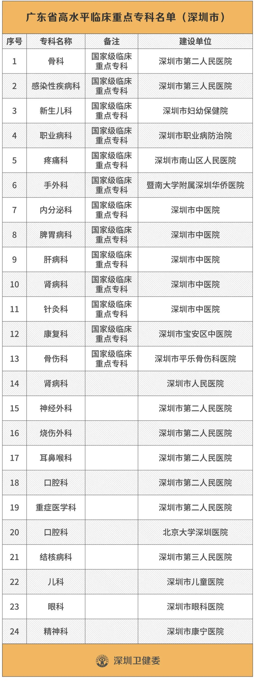 6月19日,深圳市衛(wèi)健委公布了2020-2024年的深圳市醫(yī)學(xué)重點(diǎn)學(xué)科立項(xiàng)名單,包括80個(gè)重點(diǎn)學(xué)科、15個(gè)重點(diǎn)培育學(xué)科。此外,深圳還有24個(gè)??迫脒x“省重點(diǎn)”名單,其中13個(gè)是國(guó)家衛(wèi)健委或國(guó)家中醫(yī)藥管理局認(rèn)定的國(guó)家級(jí)臨床重點(diǎn)???。這份名單是2019年由廣東省衛(wèi)健委公布的“廣東省高水平臨床重點(diǎn)??啤泵麊?。