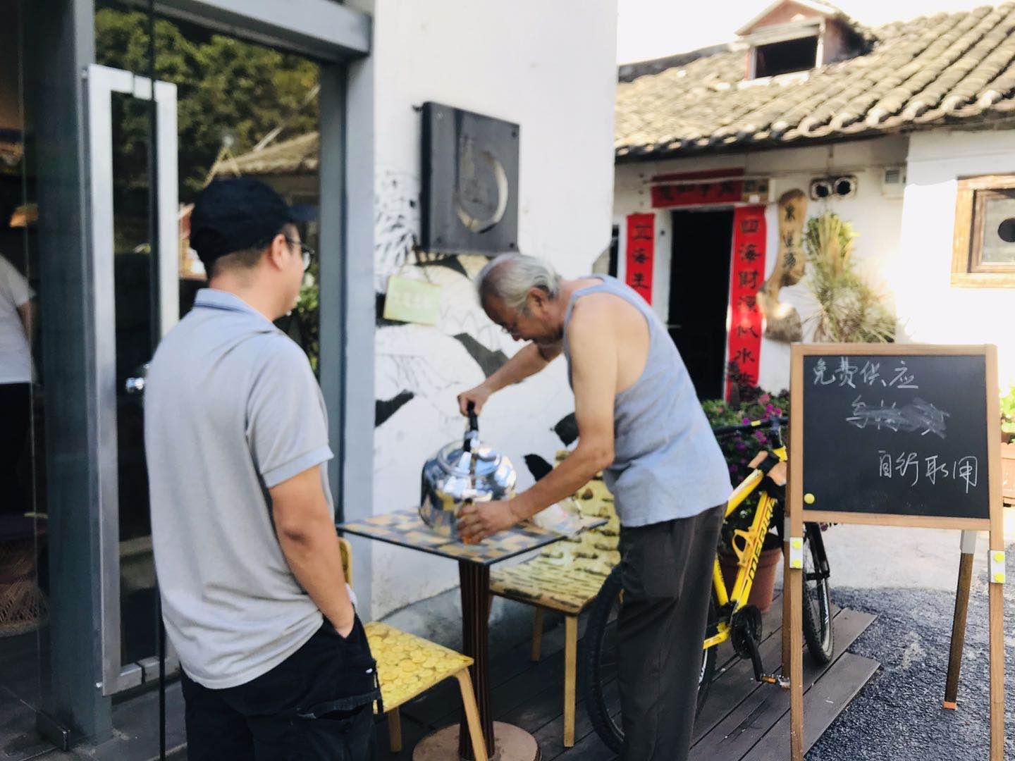 一張桌子、兩把椅子、一壺水就是一個(gè)涼茶點(diǎn),一旁支起的黑板上還寫(xiě)著“免費(fèi)供應(yīng)、自行取用”八個(gè)字。這里的涼茶從下午三點(diǎn)半開(kāi)始準(zhǔn)時(shí)向過(guò)往行人免費(fèi)提供,一直到晚上七八點(diǎn)。愛(ài)心涼茶供應(yīng)點(diǎn)的發(fā)起人叫陳小林,熟悉他的人都稱呼他小林哥。