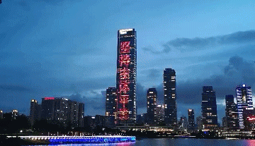 五座地標(biāo)建筑外墻光影變幻,四道標(biāo)語慢慢顯現(xiàn)出來。分別是: