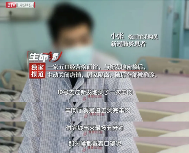 據小張回憶,6月10日,他在新發(fā)地牛羊肉大廳購物不超過5分鐘,且全程佩戴了口罩但還是“中招”了。
