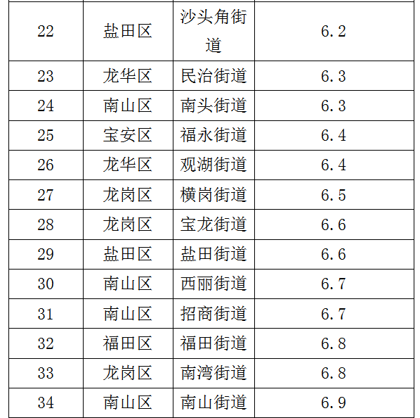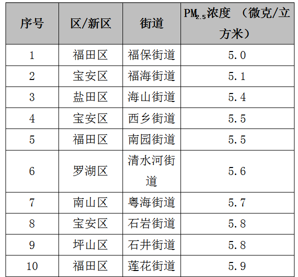 今年6月,全市74個街道PM2.5濃度在5.0-10.2微克/立方米之間,均值為7.0微克/立方米。排名前十的是:福保、福海、海山、西鄉(xiāng)、南園、清水河、粵海、石巖、石井和蓮花等街道,排名倒數(shù)前十的是:觀瀾、坪地、龍?zhí)?、大浪、馬田、公明、龍崗、龍華、沙井和鳳凰等街道。