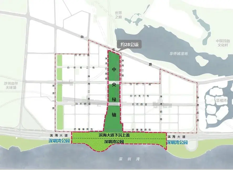 今年6月6日上午,該基地舉行中央綠軸項(xiàng)目開(kāi)工活動(dòng),此次開(kāi)工的中央綠軸項(xiàng)目南北全長(zhǎng)約1.0公里,最大寬度達(dá)210米,是連接塘朗山——華僑城濕地——深圳灣“通山達(dá)?!钡暮诵目臻g軸線。隨著濱海大道深超總段下沉工程建設(shè),未來(lái)深超總紅線內(nèi)景觀將與深圳灣公園無(wú)縫銜接,共同構(gòu)成南北貫通的中央綠軸體系。