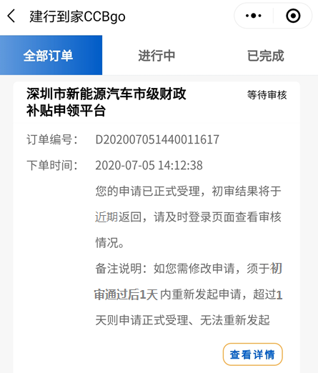 客戶完成補貼申請?zhí)峤缓?,平臺將進行首次初審,初審結果將于近期返回并通過短信方式告知客戶。屆時,客戶可通過登錄“建行到家CCBgo-我的-我的申請”查看審核進展。