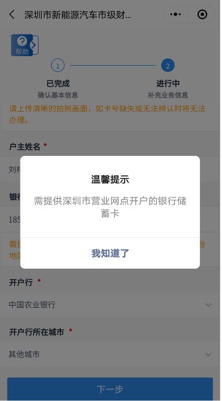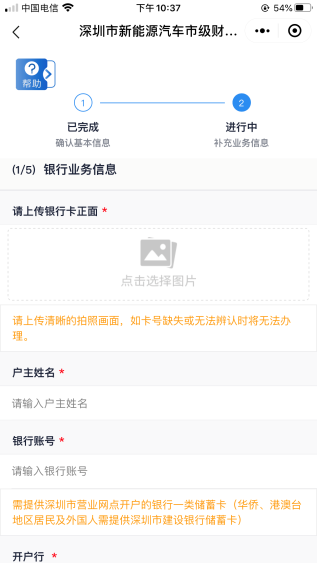 客戶需上傳銀行卡照片,并填寫銀行賬號、開戶行信息。開戶行如不在選項范圍內可選擇“其他”自填。其中,銀行賬號需為深圳市營業(yè)網(wǎng)點開戶的銀行一類儲蓄卡,華僑、港澳臺地區(qū)居民及外國人需提供深圳市建設銀行一類儲蓄卡。