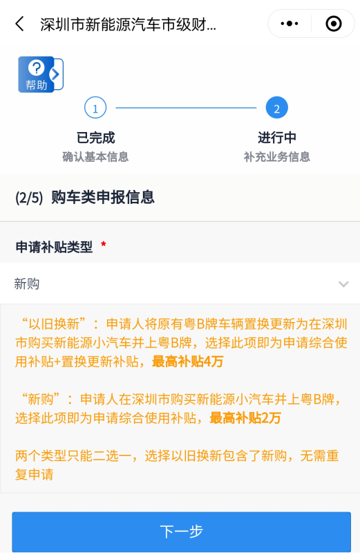 步驟5:購車類申報信息——選擇申請補貼類型