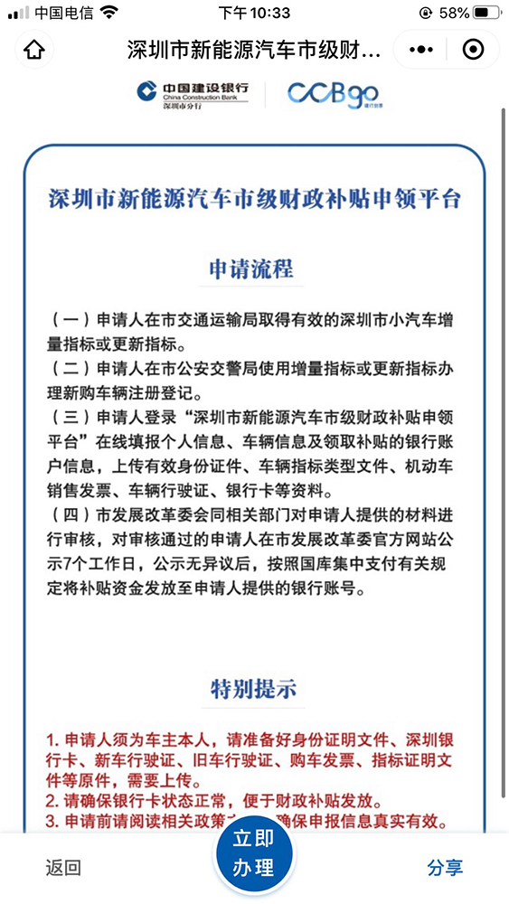 客戶可通過i深圳微信公眾號、深圳市發(fā)展和改革委員會官方網(wǎng)站或微信公眾號、深圳交警微信公眾號或建行到家CCBgo小程序登錄“深圳市新能源汽車市級財政補貼申領”平臺。