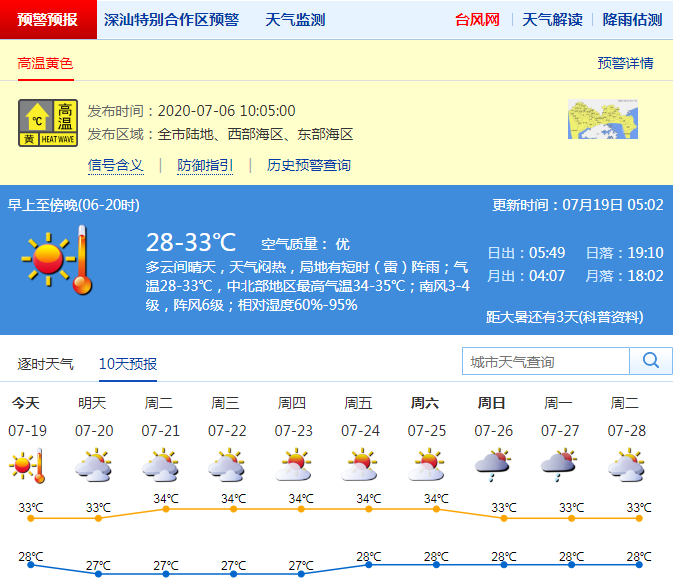 見圳客戶端·深圳新聞網(wǎng)2020年7月19日訊 深圳市氣象臺(tái)預(yù)計(jì),19-20日我市多云間晴天,局地有短時(shí)(雷)陣雨,氣溫28℃-33℃,中北部最高氣溫34℃-35℃;21-25日晴天到多云,局部偶有短時(shí)(雷)陣雨,悶熱加劇。