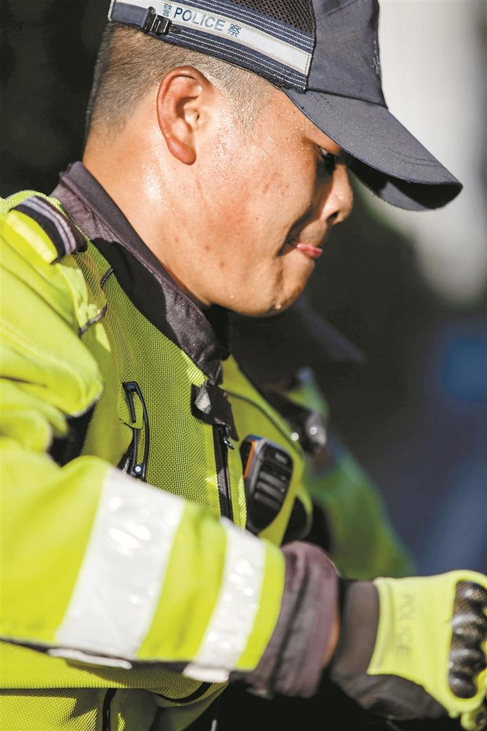 “深圳最近的天氣太熱了,到了中午,地面溫度估計(jì)得有40℃了,我們因?yàn)榇髦谡郑忸^還得加上頭盔,感覺(jué)確實(shí)挺難受的?!鄙钲诮痪仙酱箨?duì)機(jī)訓(xùn)中隊(duì)的鐵騎小哥時(shí)云財(cái),每天早高峰開(kāi)始就駕駛鐵騎穿梭在大街小巷,直到中午太陽(yáng)最盛的時(shí)候。摘下頭盔,眼睫毛上都是汗滴,更不用說(shuō)脫下熒光黃的制服,里面是層層疊疊早已被浸透發(fā)白的衣衫。