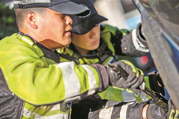 時(shí)云財(cái)和同事馬上幫助陳先生從車(chē)后備箱拿出換胎工具和備胎,在保證安全的前提下,僅用10分鐘就更換好輪胎?!疤兄x你們了,深圳交警‘小黃人’真的是我們最信任的人,有你們?cè)谖矣X(jué)得上路開(kāi)車(chē)就很放心?!标愊壬蛔〉馗兄x、稱贊交警鐵騎小哥。