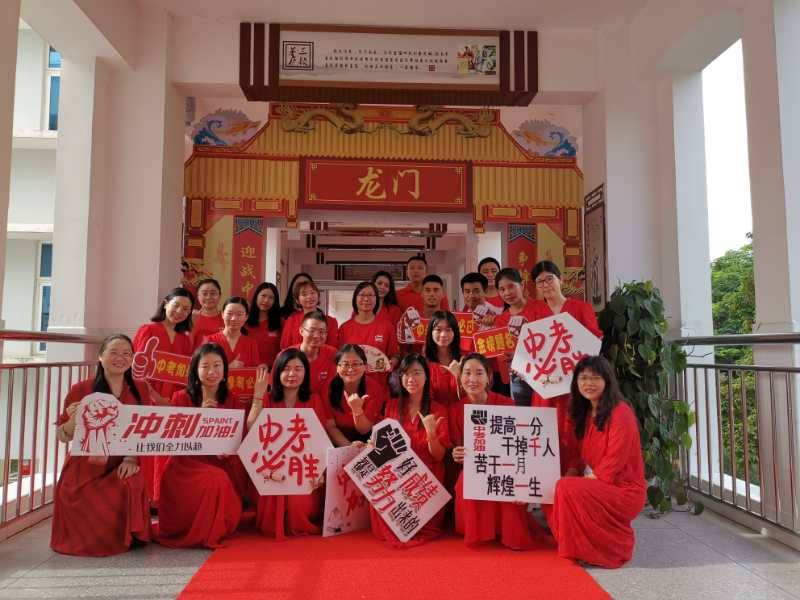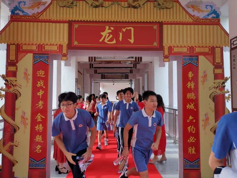龍崗六約學校全體行政人員與九年級老師,穿著紅色送考服送考,寓意“鴻運當頭”。九年級學生走過龍門,踏上紅地毯,自帶炫酷出場bgm。(記者李麗