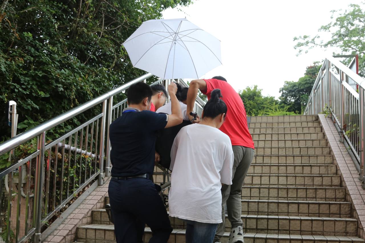東升學(xué)??键c(diǎn)有一位行動(dòng)不便的考生,學(xué)校派三名工作人員提前護(hù)送考生到考場(chǎng)。 (記者李麗