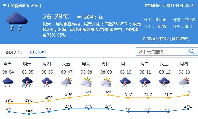 見(jiàn)圳客戶端·深圳新聞網(wǎng)2020年8月4日訊 今年第3號(hào)臺(tái)風(fēng)“森拉克”(熱帶風(fēng)暴級(jí))已于8月2日14時(shí)40分前后在越南清化市登陸,并逐漸減弱消失。第4號(hào)臺(tái)風(fēng)“黑格比”(熱帶風(fēng)暴級(jí))趨向華東沿海。據(jù)市氣象臺(tái)消息,4日有間歇性陣雨,局部大雨到暴雨,氣溫25-29℃;4日夜間起雨勢(shì)加強(qiáng),5日有暴雨局部大暴雨,陣風(fēng)6-7級(jí);6日白天起降水逐漸減弱,7-9日漸趨悶熱。