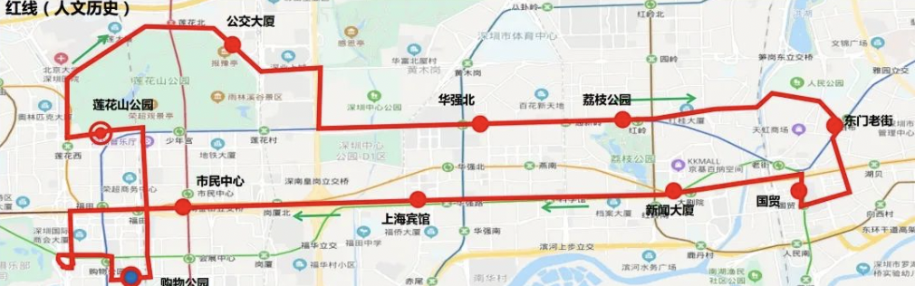 ??空军c:蓮花山公交總站→公交大廈→華強北→荔枝公園→東門老街→國貿(mào)→新聞大廈→上海賓館→市民中心→購物公園地鐵站→蓮花山公園→蓮花山公交總站