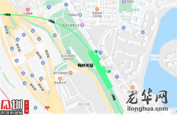 梅林關(guān)站位于梅觀路與豐澤湖小區(qū)之間綠化帶內(nèi),整體與梅觀路平行,呈南北走向,車(chē)站南端頭至星河丹堤小區(qū)內(nèi),北端頭至梅林關(guān)檢查站出關(guān)口處,西側(cè)緊靠梅觀路。