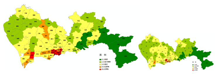 圖3 預(yù)計(jì)臺(tái)風(fēng)季工作日(左)、普通工作日(右)晚高峰全市主要街道交通運(yùn)行狀態(tài)圖