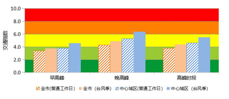 根據(jù)往年數(shù)據(jù)分析,臺(tái)風(fēng)季期間受降雨影響,工作日深圳全市早、晚高峰時(shí)段道路交通運(yùn)行指數(shù)將有所上升,預(yù)計(jì)工作日高峰時(shí)段全市交通運(yùn)行水平處于“緩行”等級(jí),通勤時(shí)長將比普通工作日多花費(fèi)30%左右。其中,中心城區(qū)受降雨影響較大,早、晚高峰運(yùn)行速度下降將較明顯。