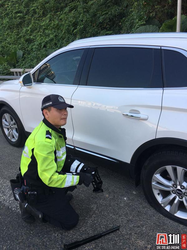 事情發(fā)生在10月11日早上10時(shí)30分許,劉先生駕車出外辦事,車輛行駛至東環(huán)高架西往東方向時(shí),突然一聲巨響左后輪輪胎爆裂車輛半路拋錨,當(dāng)時(shí)正值交通早高峰,過(guò)往車輛不斷,故障車輛停在道路中間導(dǎo)致路段交通擁堵,車主劉先生一時(shí)間不知所措,只能留在原地等待救援。此時(shí)正在執(zhí)行巡邏任務(wù)的羅湖交警鐵騎組長(zhǎng)陳展廷見(jiàn)狀,立即停下警車上前查看情況,了解情況后,為了緩解該路段的交通擁堵,防止出現(xiàn)交通意外,陳展廷立即讓劉先生把車停靠在最右側(cè)車道,然后安排隊(duì)員用警車在故障車輛周邊設(shè)置出了安全警戒區(qū)域,另一位隊(duì)員則對(duì)過(guò)往車輛進(jìn)行指揮疏導(dǎo)及勸慰駕駛?cè)瞬灰保诎踩珔^(qū)域等待,陳展廷則俯下身為爆胎車輛更換輪胎。約15分鐘的忙碌后,三位鐵騎隊(duì)員已滿身是汗,但在他們的密切協(xié)調(diào)配合下,快速幫助駕駛?cè)藙⑾壬鷶[脫困境,險(xiǎn)情在最短時(shí)間內(nèi)被及時(shí)排除,道路交通秩序也恢復(fù)正常,這暖心一幕讓劉先生很是感動(dòng),緊緊握著陳展廷同志的手連聲表示感謝。