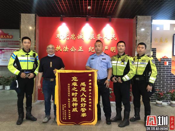 10月14日上午11時(shí)許,劉先生帶著錦旗來(lái)到羅湖交警大隊(duì)?!案兄x交警大隊(duì)機(jī)訓(xùn)中隊(duì)陳展廷組長(zhǎng)、黎警官、黃警官對(duì)我的幫助,今天專程過(guò)來(lái)感謝你們。”劉先生激動(dòng)地說(shuō)。