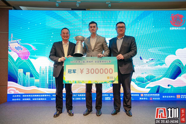 王志強與麥帆為王天一頒發(fā)今年“鵬城杯”獎杯以及30萬元的冠軍獎金。王天一表示,“鵬城杯”是國內(nèi)平均水平最高的賽事,經(jīng)過兩年成功辦賽,現(xiàn)在影響力越來越大,受到廣大棋手們和社會各方的重視,感謝深圳市文化廣電旅游體育局與佳兆業(yè)的鼎力支持。而“鵬城杯”也讓他在2020年末實現(xiàn)了一個小目標(biāo),今年唯一的一個個人賽冠軍,也實現(xiàn)了每年都能獲得一個冠軍的愿望。