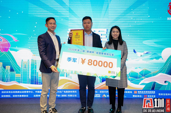 見圳客戶端·深圳新聞網(wǎng)12月31日訊(記者 郭含笑)12月31日下午,由佳兆業(yè)呈現(xiàn)的第二屆“鵬城杯”全國象棋排位賽在深圳市羅湖區(qū)陽光酒店舉行頒獎儀式。王天一獲得冠軍以及30萬元的獎金,趙鑫鑫、孟辰分別獲得了亞軍、季軍。深圳市文化廣電旅游體育局副巡視員王志強、體育產(chǎn)業(yè)發(fā)展處副處長李翊,深圳市羅湖區(qū)文化廣電旅游體育局局長薛江,深圳棋院院長劉適蘭,佳兆業(yè)集團董事局副主席兼總裁麥帆,佳兆業(yè)文體科技集團主席兼總裁舒立、副總裁鄭威,佳兆業(yè)體育產(chǎn)業(yè)(深圳)有限公司總經(jīng)理馬愷,中國象棋協(xié)會競賽主管李淼,騰訊文化與內(nèi)容公共事務(wù)高級政務(wù)經(jīng)理張嘉豪,深圳市象棋協(xié)會會長曹陽,以及裁判長、參賽棋手等嘉賓共同出席閉幕儀式。