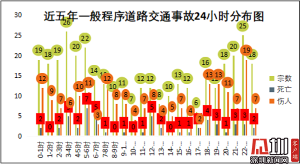 羅湖交警通過研判分析近5年的事故,發(fā)現(xiàn)凌晨5時(shí)至7時(shí),是亡人事故的高發(fā)的時(shí)段之一;凌晨3至6時(shí)、夜間21至22時(shí)是一般程序道路交通事故高發(fā)時(shí)段,分別發(fā)生事故68宗和45宗、占總數(shù)的18.84%和12.47%。其中凌晨的5時(shí)至7時(shí)是亡人事故的高發(fā)時(shí)段之一,占總亡人事故的22.64%。