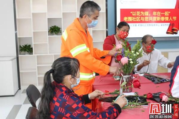 從結(jié)婚40年的老夫老妻,到年輕的情侶;從服務(wù)社區(qū)20年的清潔工人,到飲食行業(yè)的年輕服務(wù)員;從退休老人到丈夫殘疾的困難夫妻,無(wú)不感受到社區(qū)黨委的關(guān)懷,感受到社區(qū)的關(guān)愛(ài)。五對(duì)夫妻在社工的帶領(lǐng)下,將玫瑰、梔子花、康乃馨等鮮花細(xì)心修剪后插進(jìn)玻璃瓶。環(huán)衛(wèi)工人張哥今年60歲,30年前來(lái)到深圳,把自己的青春都奉獻(xiàn)給了這個(gè)城市,獻(xiàn)給了社區(qū),他說(shuō):“我20多年沒(méi)回過(guò)老家了,每年都是在深圳過(guò)節(jié),每年過(guò)節(jié)都要上班,今年第一次在社區(qū)過(guò)年、第一次插花?!敝灰?jiàn)張哥和妻子配合默契,妻子修剪花枝,他小心翼翼插進(jìn)瓶子里。
