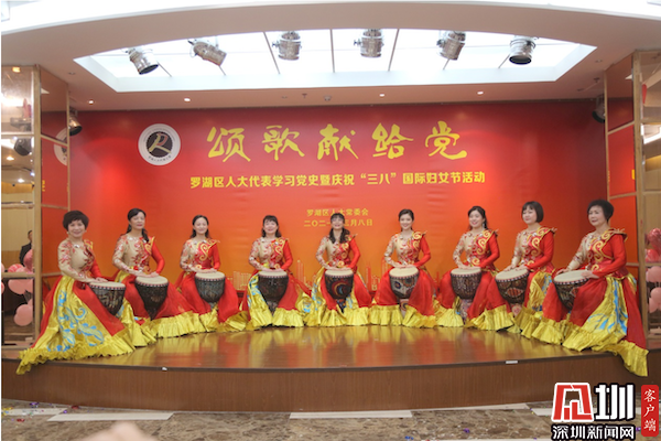 盧旭蕾、許少瓊、劉曉娜等廣東省、深圳市、羅湖區(qū)人大代表表演的手鼓節(jié)目《愛我中華》。